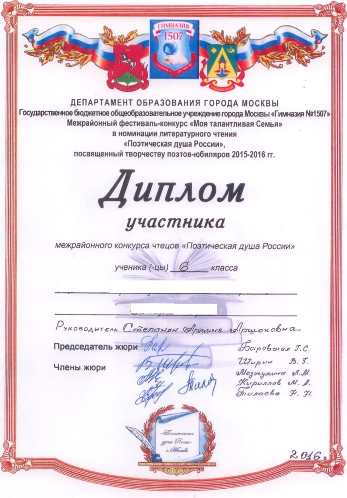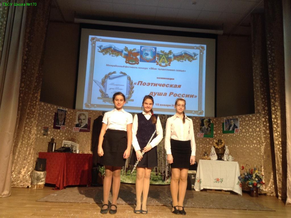 15.01.2016г. в гимназии № 1507 прошел Межрайонный фестиваль-конкурс «Моя талантливая семья» в номинации литературного чтения «Поэтическая душа России».