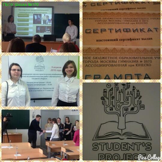 9 апреля учащиеся 10 "Г" и 11 "Е" классов СП-6 выступили с докладами на XV Международной научно-исследовательской конференции "Student`s Project" в секции "Шедевры мировой литературы" и "Естествознание". Руководители проектов Семенова М.З и Болдина Н.И.