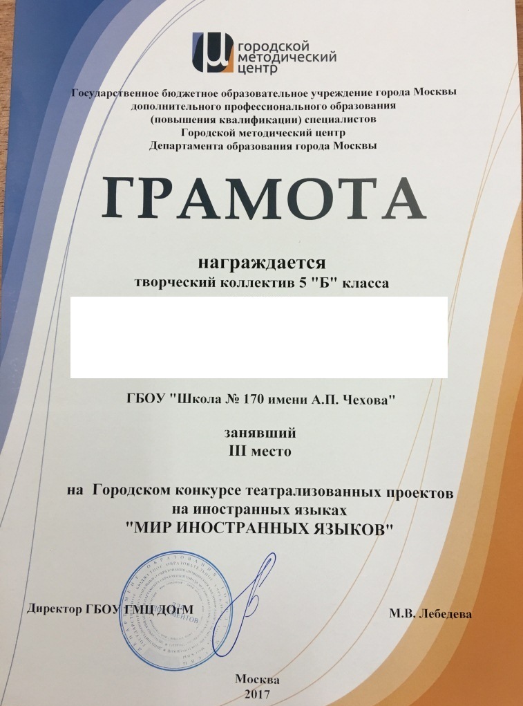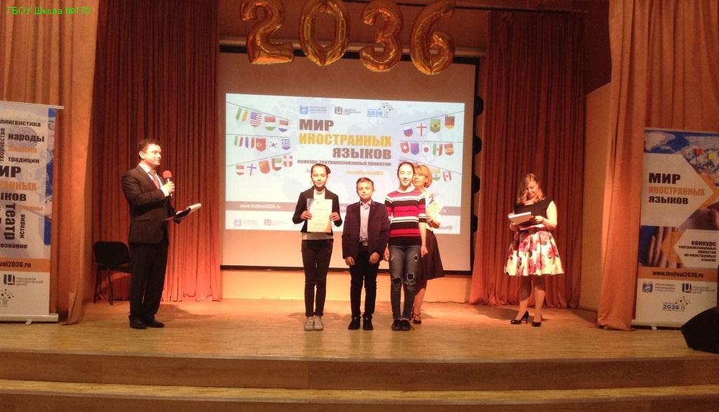20 апреля ученики 5 "Б" класса под руководством классного руководителя, учителя английского языка Медовар О.Л. приняли участие в городском фестивале театрализованных проектов "Мир иностранных языков". Творческий коллектив 5 "Б" класса занял почетное Третье место среди всех участников города Москвы! От души поздравляем ребят! Желаем дальнейших успехов и побед.