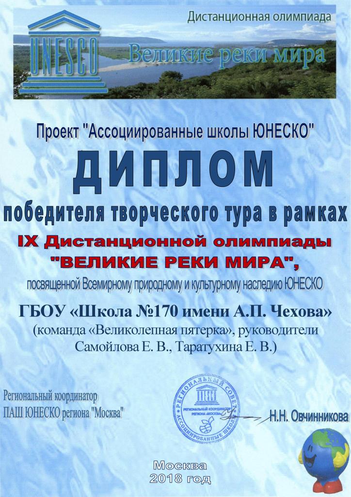 В рамках сетевого взаимодействия АШ ЮНЕСКО к участию в Международной дистанционной олимпиаде «Великие реки мира» были приглашены АШ ЮНЕСКО из разных регионов России и стран СНГ. В этом году олимпиада была посвящена Международному десятилетию сближения культур и Году культурного наследия, объявленному в Европе. Команда из нашей школы "Великолепная пятёрка", в которую входили учащиеся 10 д класса, приняла активное участие в олимпиаде и заняла 1 место в творческом конкурсе.