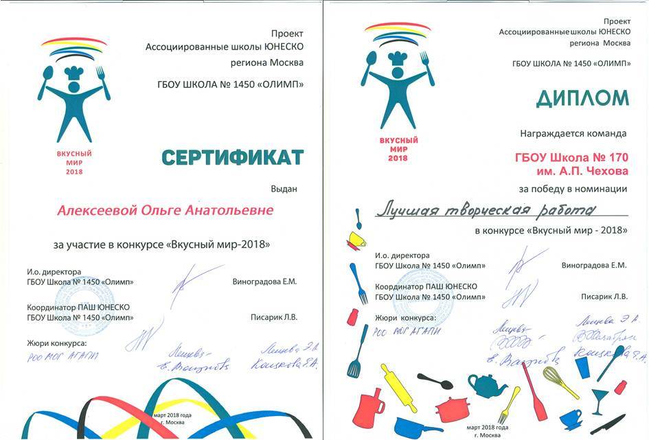 11 апреля 2018 года в ГБОУ Школа №1450 "Олимп" в рамках проекта Ассоциированных школ ЮНЕСКО (регион Москва) прошел традиционный конкурс "Вкусный мир-2018". Девиз данного мероприятия: «Национальная кухня – визитная карточка народа».