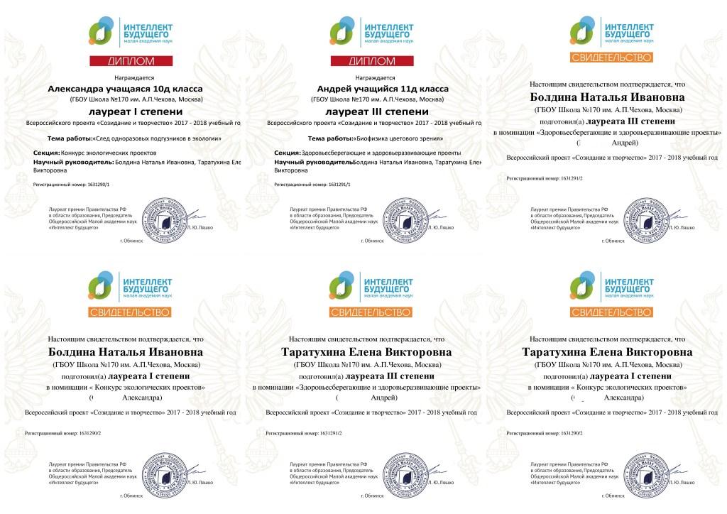 Поздравляем учащихся 10-х и 11-х классов корпуса 6, ставших лауреатами I и III степени Всероссийского проекта «Созидание и творчество» в секции "Здоровьесберегающие и здоровьеразвивающие проекты" и в секции "Конкурс экологических проектов". Руководители проектов Болдина Н.И. и Таратухина Е.В.