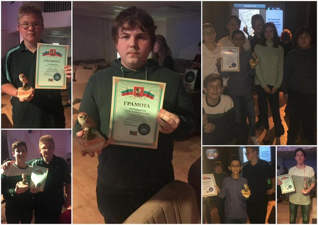 В конце октября состоялись традиционные Межрайонные игры "Что, Где, Когда" в ГБОУ № 1101. В этих играх, в разных возрастных категориях, приняли участие ученики 6А класса (младшая группа), ребята играли впервые и ученики 9А, 9Б и 10А классов. Поздравляем наших ребят с большой победой! Команда старших классов заняла 1 место, получила призовую "Сову", а ребята 6А класса заняла 3 место! Ребята - вы лучшие! Так держать! Впереди еще четыре игры, удачи!