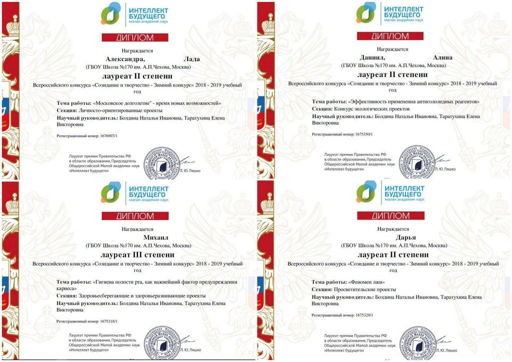 Поздравляем учащихся 10-11 классов корпуса 6, лауреатов Всероссийского конкурса проектных и исследовательских работ "Созидание и творчество". Выражаем благодарность руководителям исследовательских работ Болдиной Н.И. , учителю физики, и Таратухиной Е.В., учителю информатики.