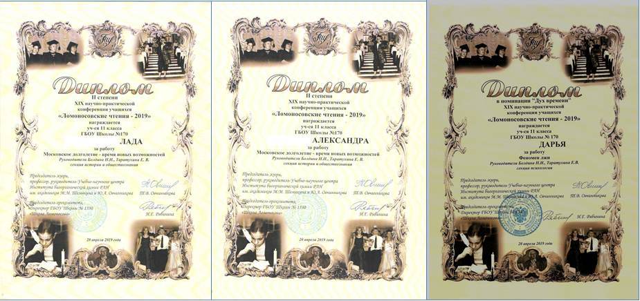 Учащиеся 10 "Г" и 11 "Д" классов корпуса 6 достойно выступили на конференции и представили свои исследовательские работы. Работа Дарьи из 11 "Д" класса "Феномен лжи" в секции "Психология" получила диплом в номинации "Дух времени", работа Александры и Лады, учениц 11 "Д" класса "Активное долголетие - время новых возможностей" в секции "История и обществознание" получила диплом II степени. Огромное спасибо руководителям проектов Болдиной Н.И. и Таратухиной Е.В.