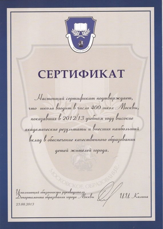 ГБОУ СОШ №170 входит в число 400 школ Москвы, показавших в 2012-13 уч.году высокие академические результаты и внесших наибольший вклад в обеспечение качественного образования детей жителей города.