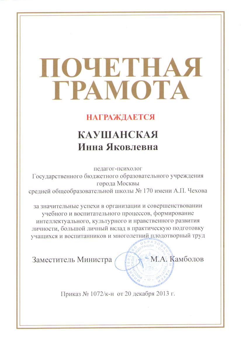 Поздравляем педагога-психолога Каушанскую Инну Яковлевну, награждённую Почётной грамотой Министерства образования и науки Российской Федерации за значительные успехи в организации и совершенствовании учебного и воспитательного процессов, формирование интеллектуального, культурного и нравственного развития личности, большой личный вклад в практическую подготовку учащихся и воспитанников и многолетний плодотворный труд.