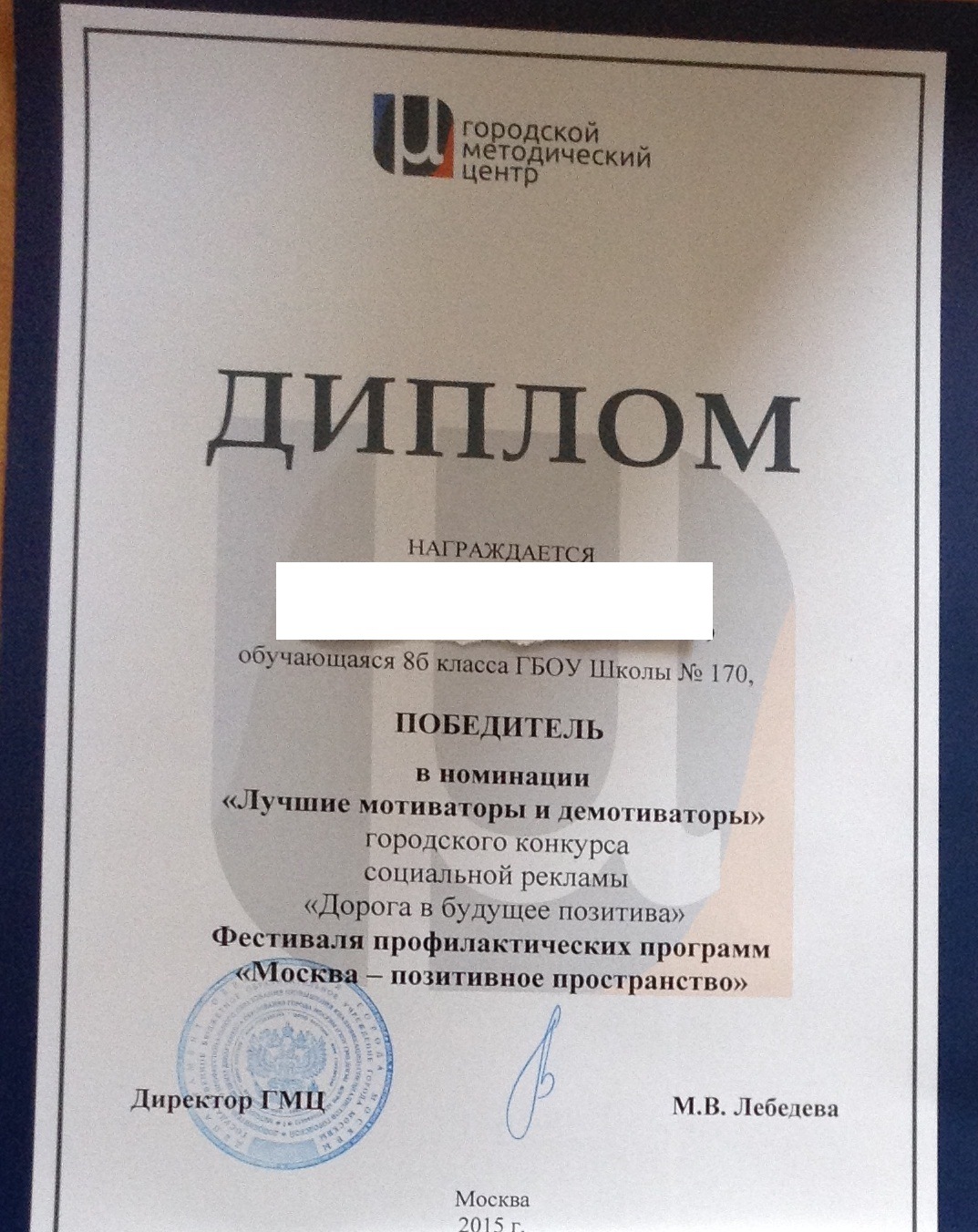 Городской методический центр вручил Диплом победителя учащийся 8Б класса СП-170 в номинации "Лучшие мотиваторы и демотиваторы" городского конкурса социальной рекламы "Дорога в будущее позитива" Фестиваля профилактических программ "Москва - позитивное пространство"