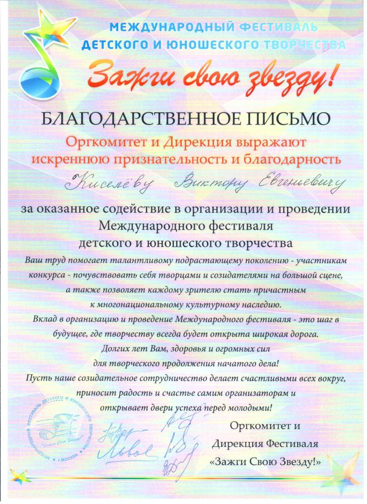 За 17 лет своего существования Международный фестиваль детского и юношеского творчества «Зажги Свою Звезду!» стал значительным событием в культурной жизни не только Москвы, но и всей России. На его сцене зажглась не одна настоящая Звезда и многие его лауреаты (а их более 2000 человек) уже стали настоящими профессиональными артистами, танцорами и вокалистами.