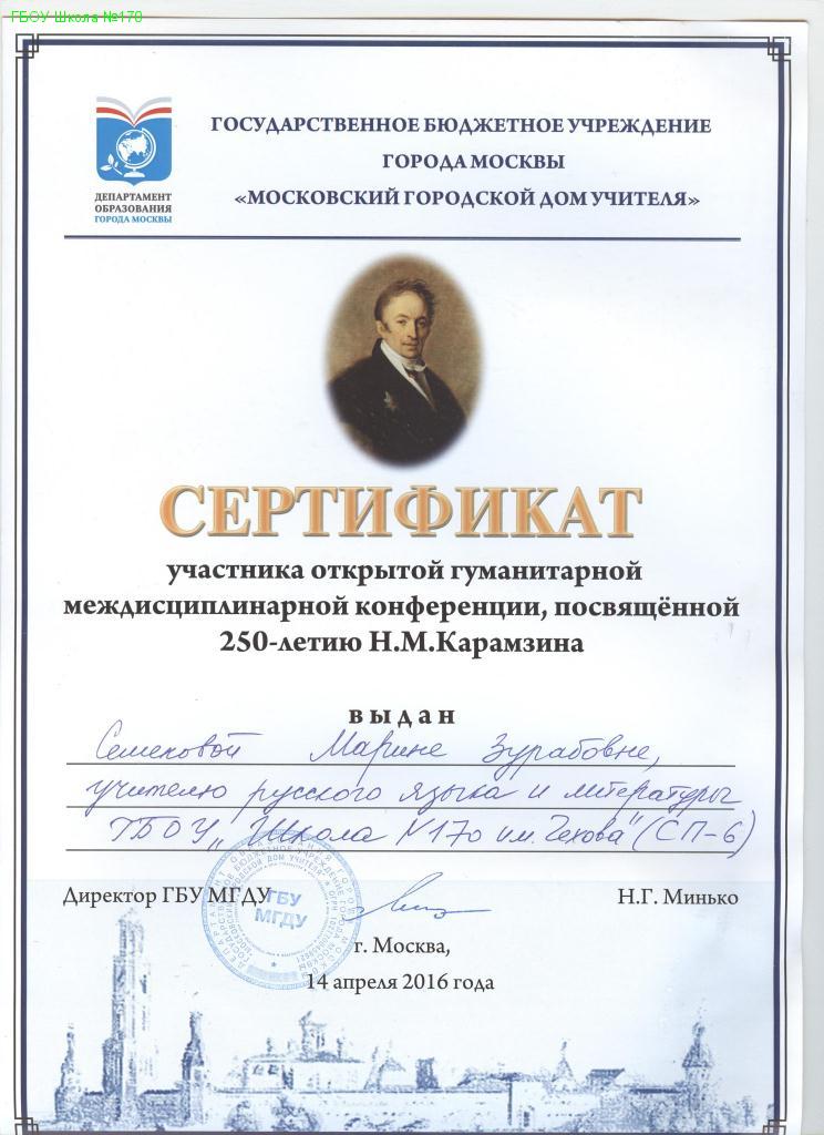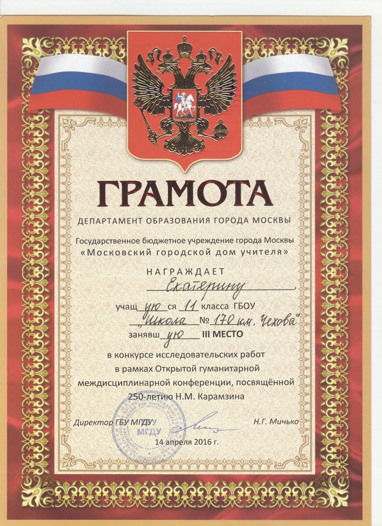 Поздравляем ученицу 11е класса СП-6, занявшую 3 место в конкурсе исследовательских работ на Открытой гуманитарной междисциплинарной конференции, посвящённой 250-летию Н.М.Карамзина. Руководитель проекта Семёнова М.З., консультант Таратухина Е.В.