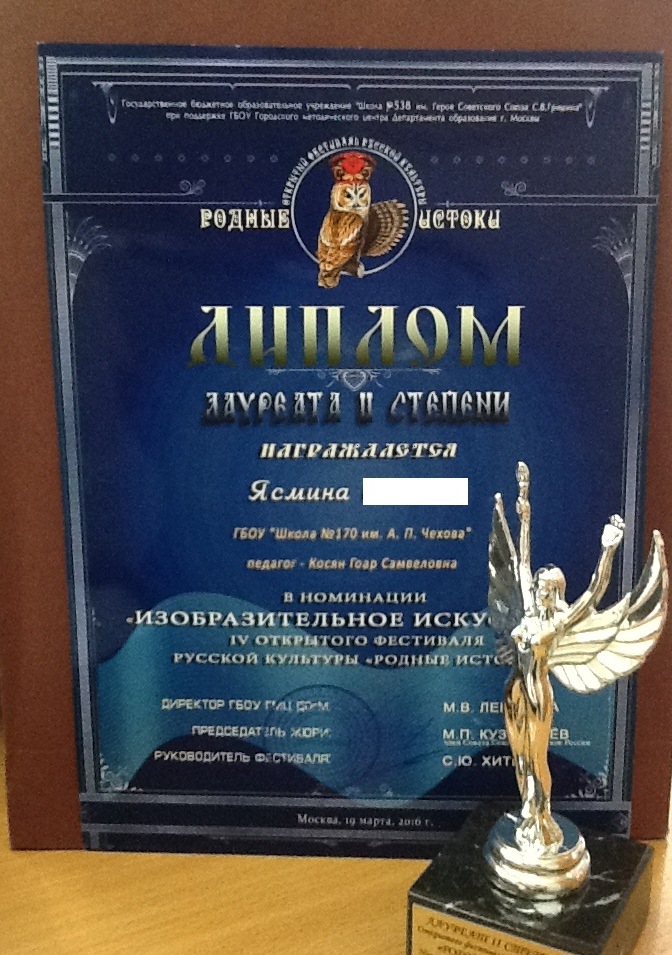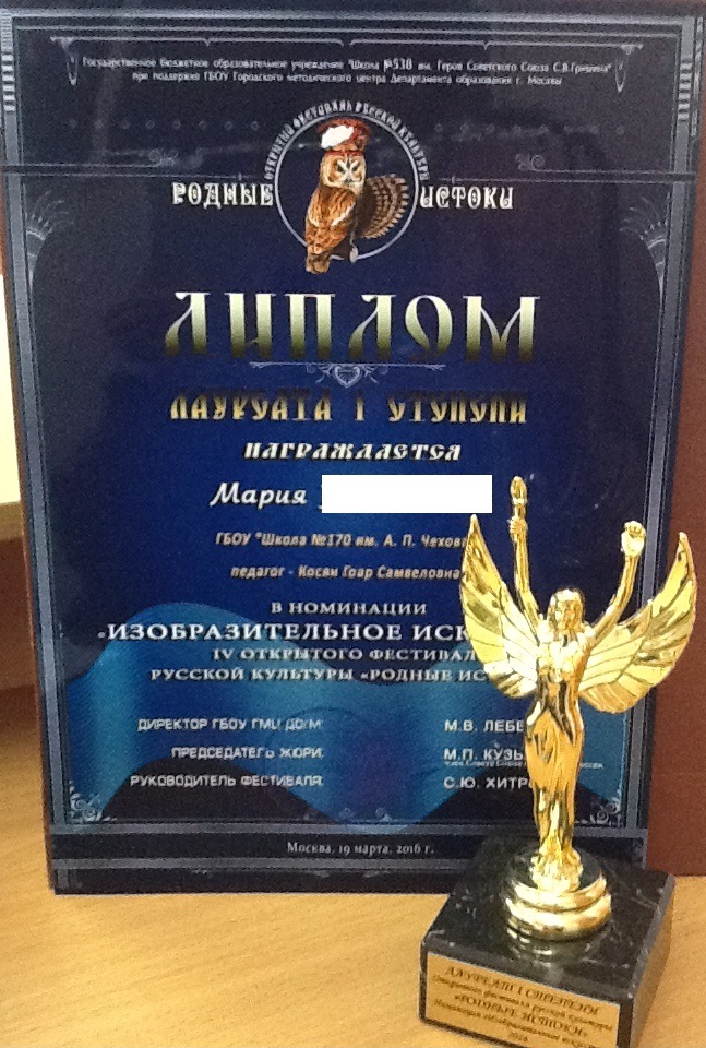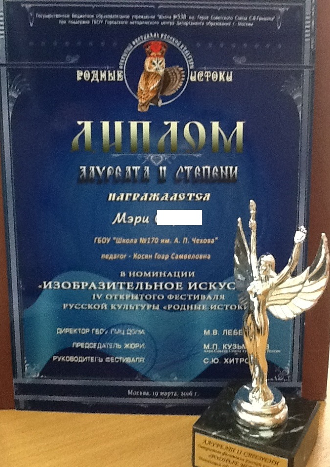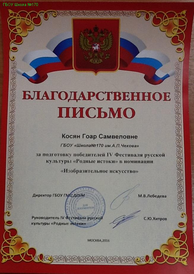 Городской методический центр выражает благодарность Косян Г. С. за подготовку победителей IV Фестиваля русской культуры "Родные истоки" в номинации "Изобразительное искусство".