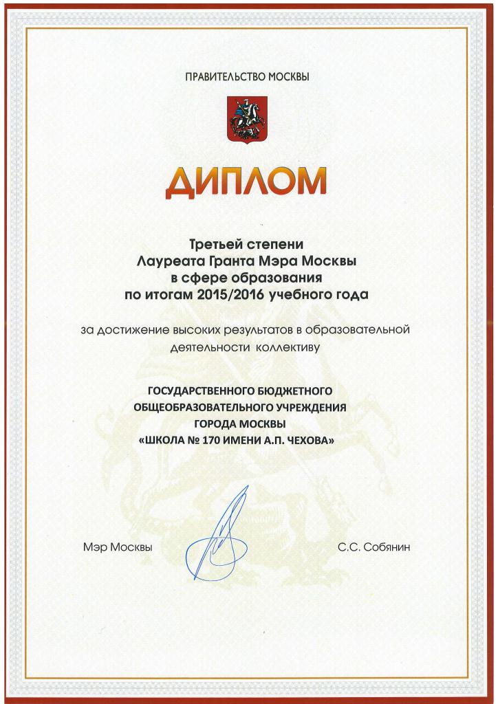 ГБОУ Школа №170 - Лауреат Гранта Мэра Москвы 25.08.2016