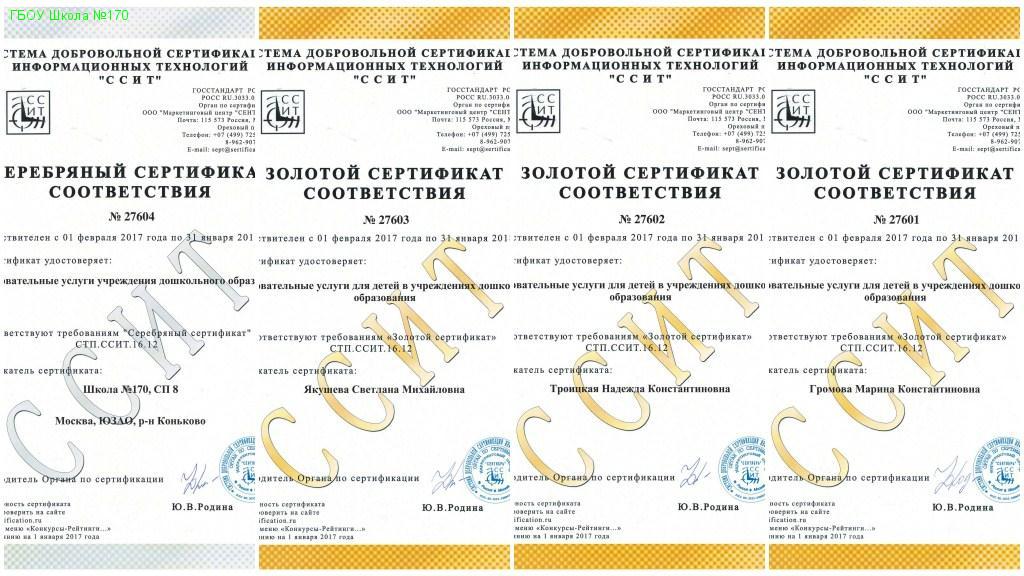 По состоянию на 01.01.2017г. наш корпус занимает 78 место в Рейтинге учреждений дошкольного образования среди 1998 представленных учреждений дошкольного образования. Рейтинги рассчитываются на основании итогов конкурсов, аккредитованных в Системе добровольной сертификации информационных технологий России. Рейтинговая оценка интегрирует в себе многие факторы, показывающие качество передачи информации «воспитатель-дошкольник», качество преподавания, качество организации образования, отношение к образованию в регионе. Рейтинговая оценка — доминанта качества образования. На основании рейтингов подведены итоги сертификации на соответствие требованиям СТП.ССИТ.16.12 «Образовательные услуги». Корпус № 8 ГБОУ Школа № 170 вошел в 4% лучших! Это подтверждает, что уровень оказываемых услуг в учреждении соответствует требованиям «Серебряный сертификат». Сертификат и Знак соответствия «ССИТ» подтверждает перед российским и зарубежным потребителем услуг, что держатель сертификата, учреждение или частное лицо, оказывает услуги самого высокого уровня.