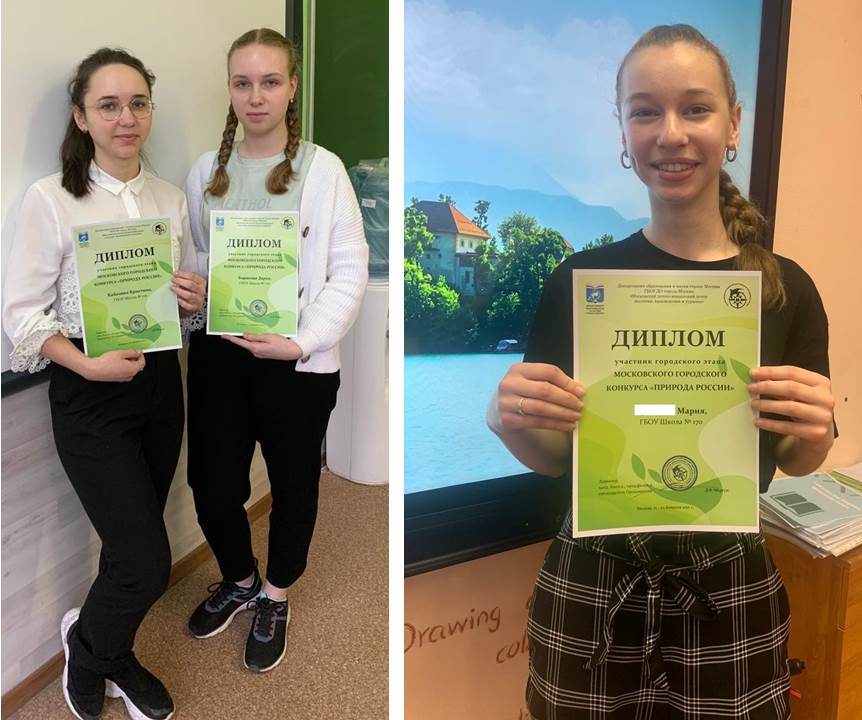 Поздравляем победительниц окружного этапа Московской городской эколого-биологической олимпиады "Природа России", которые достойно представили нашу школу на городском конкурсе. Это Кристина К. и Дарья Б. - ученицы 8"В" класса, а также обучающаяся 9 "В" класса Мария К.