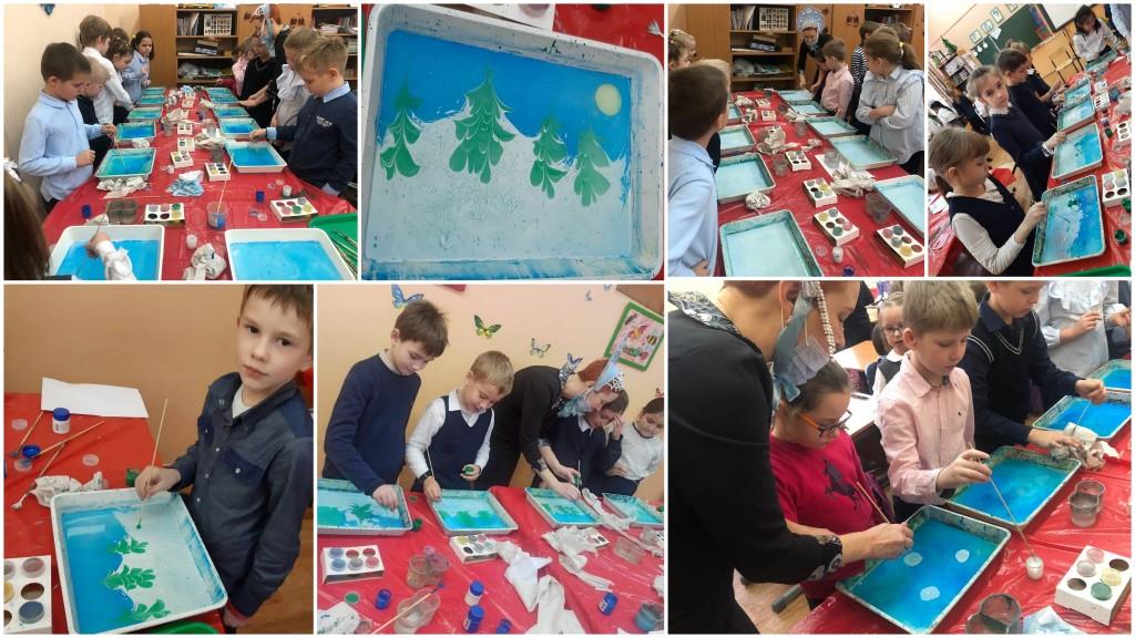 Младшие школьники посещают мастерскую Снегурочки, чтобы зарядиться новогодним настроением. Снегурочка Юлия Викторовна знакомит ребят с творчеством ЭБРУ (рисование на воде), которая развивает воображение и мелкую моторику. Результаты творчества ребят поражают красотой и необычайной техникой.