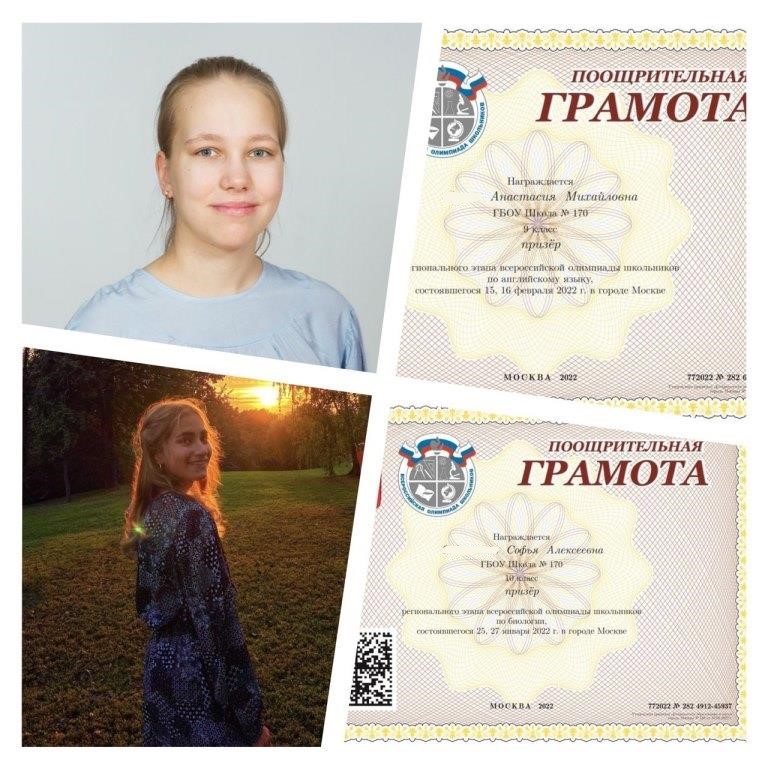Лучшими на региональном уровне стали: ученица 9Г класса Анастасия С. - призер олимпиады по английскому языку, ученица 10В Софья С. - призер по биологии, а также участник олимпиады по литературе и обществознанию.