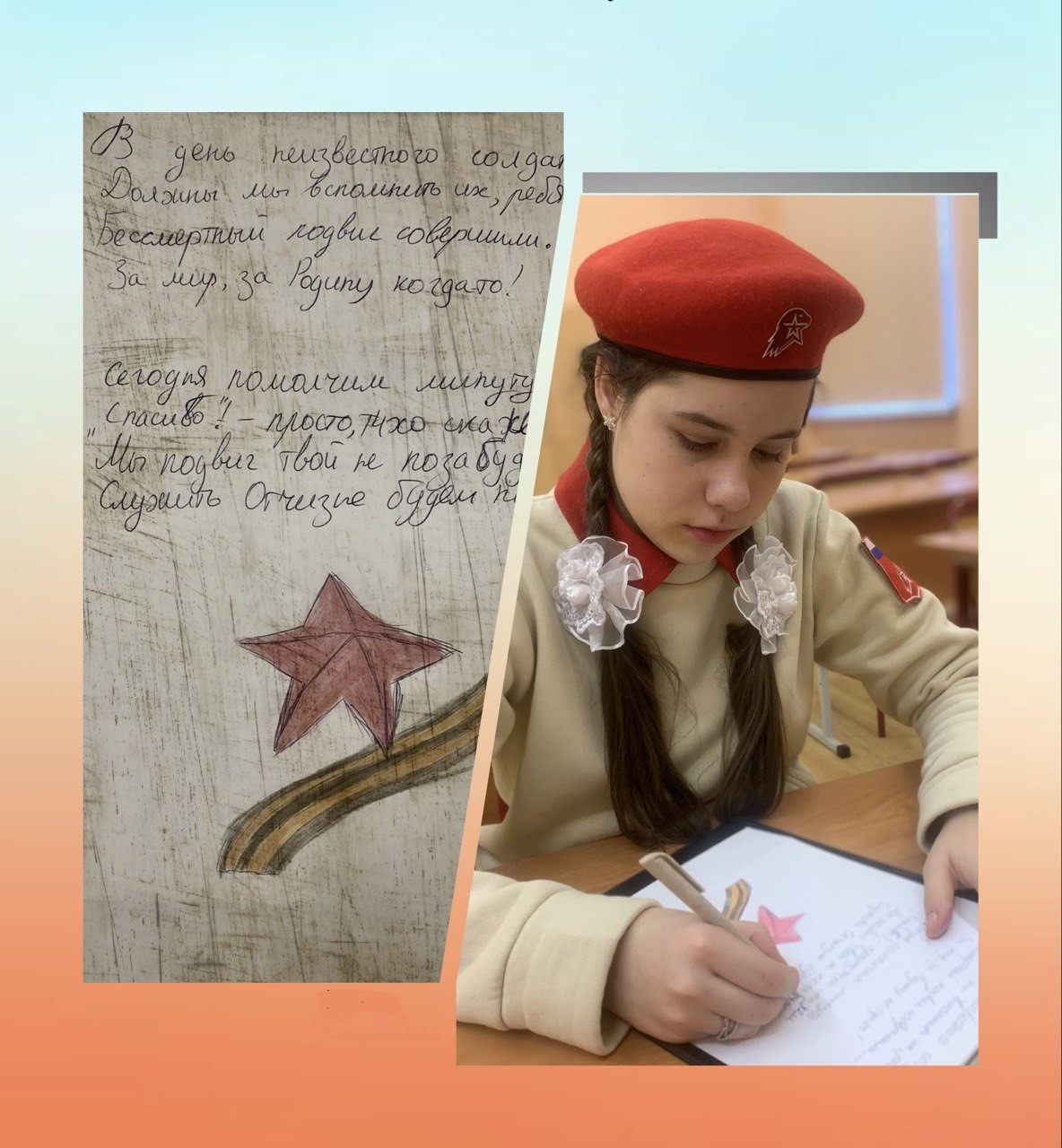 В преддверии памятной даты 3 декабря – Дня Неизвестного Солдата - юнармейцы отряда "Орлы" присоединилась к Всероссийской акции «Письмо Неизвестному Солдату» и написали письмо благодарности неизвестному солдату.
